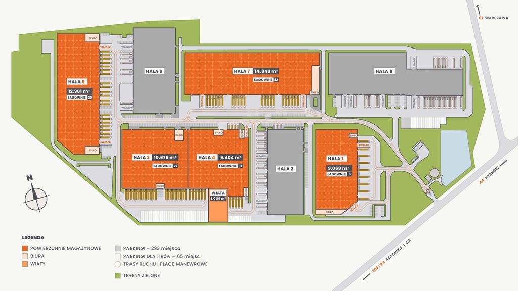 Nazwa budynku Dostępność Status budynku Całkowita pow. Dostępna pow. Rok budowy Min. moduł. Certyfikat Powierzchnia biurowa Wys. składowania Siatka słupów Nośność posadzki Oświetlenie Doki przeładunkowe Świetliki Klapy dymowe Tryskacze Ogrzewanie Brama wjazdowa z poziomu "0"