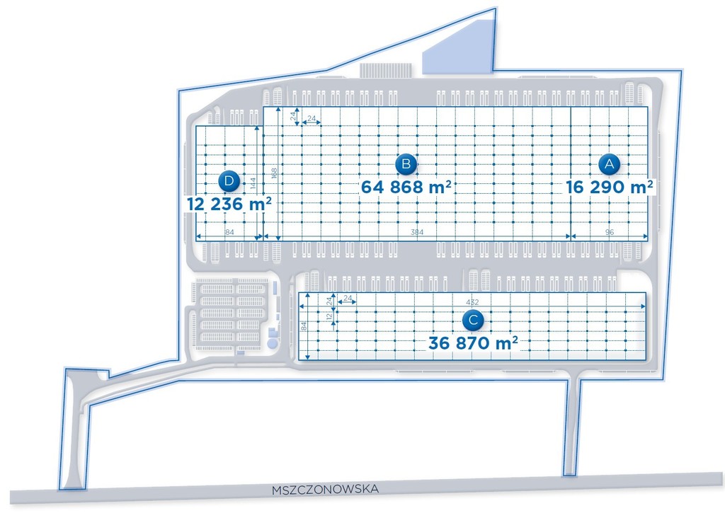 Nazwa budynku Dostępność Status budynku Całkowita pow. Dostępna pow. Rok budowy Min. moduł. Certyfikat Powierzchnia biurowa Wys. składowania Siatka słupów Nośność posadzki Oświetlenie Doki przeładunkowe Świetliki Klapy dymowe Tryskacze Ogrzewanie Brama wjazdowa z poziomu "0"
